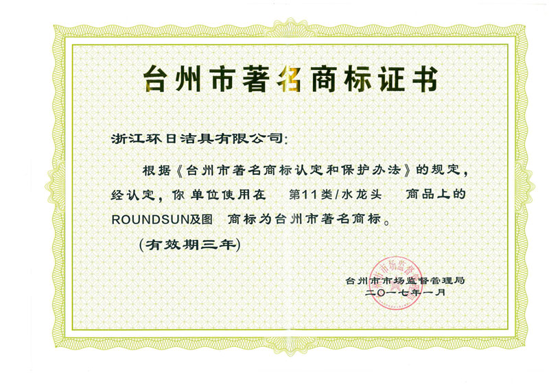 目前公司年開發(fā)新產(chǎn)品(ODM)150套,自營品牌年開發(fā)(OBM)160多套,貼牌加工年開發(fā)(OEM)200多套,申請獲得中國國家知識產(chǎn)權(quán)局產(chǎn)品外觀設(shè)計專利160項、實用型專利16項。先后榮獲臺州市進(jìn)出口行為規(guī)范企業(yè)、臺州市著名商標(biāo)、臺州市名牌產(chǎn)品、省工商信用企業(yè)A級、省水暖閥門誠心企業(yè)、省重信用守合同AA級、省高新技術(shù)企業(yè)、中國衛(wèi)浴知名品牌、中國衛(wèi)浴綠色水龍頭等,已經(jīng)通過了ISO9001認(rèn)證、CE認(rèn)證、以及ACS產(chǎn)品認(rèn)證。2010年通過英國WRAS認(rèn)證,2011年通過ISO14001環(huán)境體系認(rèn)證,同年通過LGA認(rèn)證。環(huán)日緊跟時代潮流,融合傳統(tǒng)與現(xiàn)代元素,帶來古典美與現(xiàn)代美的雙重享受。
