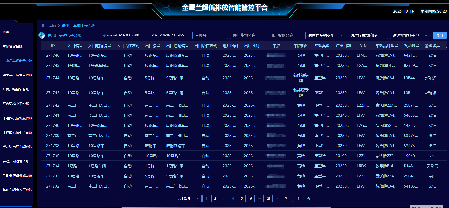 通過將現(xiàn)有門禁系統(tǒng)及地磅計量系統(tǒng)數(shù)據(jù)集成至超低排放智能管控平臺,實現(xiàn)了對運(yùn)輸車輛信息的全面數(shù)字化管理。平臺實時采集并展示包括車輛運(yùn)輸物料類型(原料、燃料、輔料、廢污、成品)、名稱、重量、運(yùn)輸類型(收/發(fā)貨)、來源地、目的地、進(jìn)出廠時間、抓拍圖片、車牌號及排放階段(VIN)等關(guān)鍵數(shù)據(jù),形成完整、可追溯的清潔運(yùn)輸電子臺賬,為超低排放管控提供數(shù)據(jù)支撐。