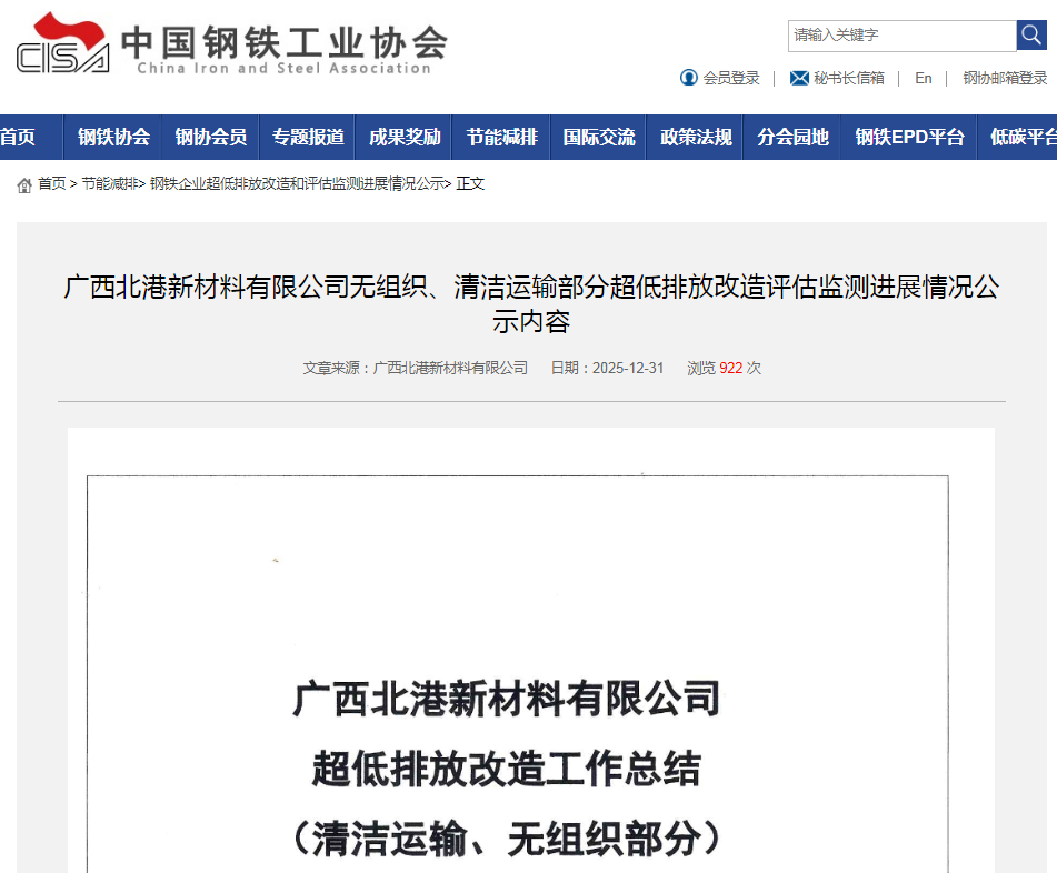 近日,廣西北港新材料有限公司(以下簡(jiǎn)稱“北港新材料”)的超低排放工作總結(jié)(清潔運(yùn)輸與無(wú)組織排放部分)在中國(guó)鋼鐵工業(yè)協(xié)會(huì)官方網(wǎng)站正式公示。該項(xiàng)目由九九智能環(huán)保于2025年4月承建,并于同年7月全面建成,目前相關(guān)設(shè)施運(yùn)行穩(wěn)定,標(biāo)志著北港新材料在綠色低碳轉(zhuǎn)型道路上邁出了堅(jiān)實(shí)一步。
