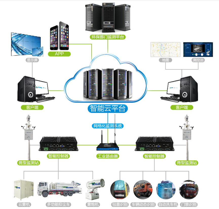 最后,通過智能管、控、治一體化技術(shù),綜合管控、運營整個抑塵系統(tǒng)工程,實時監(jiān)測現(xiàn)場除塵情況,智能調(diào)節(jié)除塵參數(shù),最大限度降低除塵系統(tǒng)運營成本,同時保證長期穩(wěn)定的除塵效果。真正實現(xiàn)對無組織排放的網(wǎng)格化、精確化、科學化、智能化的治理。
