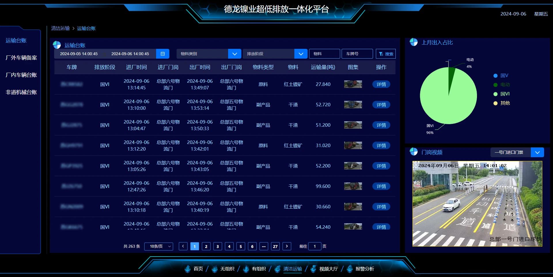 根據(jù)環(huán)保文件要求,九九在料棚出車門新建了8臺(tái)智能封閉洗車機(jī)。同時(shí)將清潔運(yùn)輸系統(tǒng)數(shù)據(jù)接入及展示在超低排放環(huán)保集中管控平臺(tái),根據(jù)超低排放政策的要求,統(tǒng)計(jì)車輛進(jìn)出廠數(shù)據(jù),物料進(jìn)出廠信息(大宗物料)數(shù)據(jù)、物資計(jì)量稱重?cái)?shù)據(jù)、產(chǎn)品運(yùn)輸基礎(chǔ)臺(tái)賬數(shù)據(jù)等各類數(shù)據(jù)。清潔運(yùn)輸各類數(shù)據(jù)上傳至管控一體化平臺(tái)2023年10月,冶金規(guī)劃研究院對(duì)德龍鎳業(yè)7月-9月清潔方式運(yùn)輸情況進(jìn)行現(xiàn)場(chǎng)核查評(píng)估,依據(jù)近三個(gè)月進(jìn)出廠大宗物料和產(chǎn)品運(yùn)輸臺(tái)賬核算了每個(gè)月清潔運(yùn)輸比例,現(xiàn)場(chǎng)核查了每一種物料和產(chǎn)品運(yùn)輸方式,抽查了部分廠內(nèi)運(yùn)輸車輛和非道路移動(dòng)機(jī)械臺(tái)賬記錄一致性和準(zhǔn)確性。統(tǒng)計(jì)分析了2023年7月-9月三個(gè)月運(yùn)輸臺(tái)賬,收集了三個(gè)月進(jìn)出廠大宗物料及產(chǎn)品的汽車運(yùn)輸過(guò)磅磅單,并與運(yùn)輸臺(tái)賬核驗(yàn)。通過(guò)機(jī)動(dòng)車環(huán)保網(wǎng)、重型柴油車排放階段查詢平臺(tái)查詢進(jìn)出廠大宗物料及產(chǎn)品汽車運(yùn)輸車輛廠內(nèi)運(yùn)輸車輛和跨區(qū)倒運(yùn)車輛的排放標(biāo)準(zhǔn)的準(zhǔn)確性,驗(yàn)證了非道路移動(dòng)機(jī)械編碼登記情況及臺(tái)賬記錄信息準(zhǔn)確性。