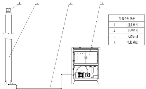 霧樁由機(jī)頭組件、立桿組件、水路系統(tǒng)、電控系統(tǒng)四部分組成。
