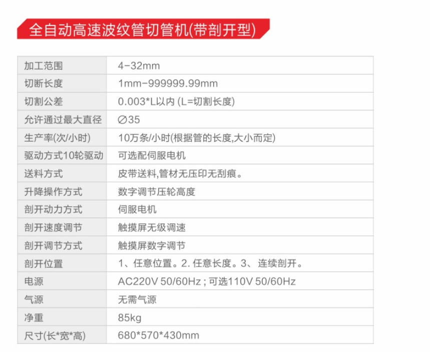 本設(shè)備適用于波紋管/PVC管/熱縮管。等薄壁管材的定長切斷和剖開;剖開功能:可以任意位置剖開、任意長度剖開、連續(xù)剖開。