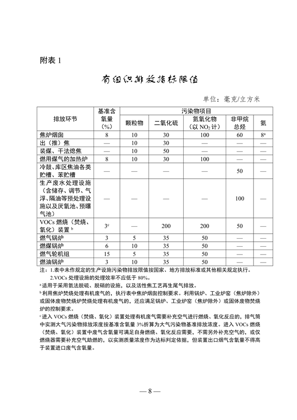 在基準含氧量8%的條件下,焦爐煙囪廢氣中顆粒物、二氧化硫、氮氧化物、非甲烷總烴、氨排放濃度小時均值分別不高于10mg/m3、30mg/m3、100mg/m3、60mg/m3、8mg/m3,其他具體指標要求見附表1。達到超低排放的焦化企業(yè)每月至少95%以上時段排放濃度小時均值滿足上述要求。