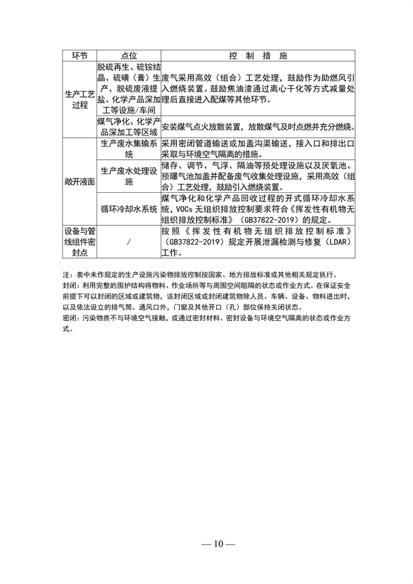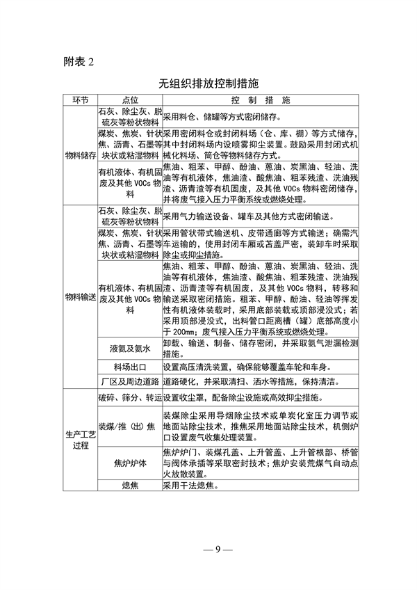 (二)無組織排放改造。物料儲存、物料輸送、生產(chǎn)工藝過程、敞開液面等無組織排放源,在保障安全生產(chǎn)的前提下,采用密閉、封閉等有效治理措施。產(chǎn)塵點按照“應收盡收”原則合理配置廢氣收集設施,優(yōu)化收集風量。石灰、除塵灰、脫硫灰等粉狀物料采用料倉、儲罐等方式密閉儲存,采用氣力輸送設備、罐車及其他方式密閉輸送。煤炭、焦炭、針狀焦等塊狀或粘濕物料采用密閉料倉或封閉料場(倉、庫、棚)等方式儲存,鼓勵采用封閉式機械化料場、筒倉等儲存方式,采用管狀帶式輸送機、皮帶通廊等方式輸送。有機液體、有機固廢及其他VOCs物料應密閉儲存,轉移和輸送應采取密閉措施,并將廢氣接入壓力平衡系統(tǒng)或燃燒處理;揮發(fā)性有機液體裝車采用底部裝載或頂部浸沒式。液氨及氨水卸載、輸送、制備、儲存密閉,并采取氨氣泄漏檢測措施。焦爐爐門、裝煤孔蓋、上升管蓋、上升管根部、橋管與閥體承插等采用密封技術;焦爐安裝荒煤氣自動點火放散裝置。煤氣凈化、化學產(chǎn)品深加工等區(qū)域安裝煤氣點火放散裝置,放散煤氣及時點燃并充分燃燒。生產(chǎn)廢水集輸應采用密閉管道輸送,生產(chǎn)廢水預處理設施及厭氧池、預曝氣池應加蓋并配備廢氣收集處理設施,采用高效(組合)工藝處理。無組織排放控制設施與生產(chǎn)設施同步正常運行,產(chǎn)塵點及生產(chǎn)設施無可見煙粉塵外逸,廠區(qū)整潔無積塵、無明顯異味。具體要求見附表2。