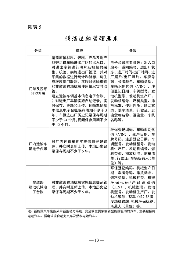 (三)清潔運輸改造。煤炭、焦炭等大宗物料和產(chǎn)品中長距離運輸優(yōu)先采用鐵路或水路,短途接駁和廠內物料轉運優(yōu)先采用管狀帶式輸送機或皮帶通廊。進出廠區(qū)物料和產(chǎn)品采用鐵路、水路、管道、管狀帶式輸送機、封閉皮帶通廊等清潔方式運輸比例不低于80%,清潔運輸比例達不到80%的部分采用新能源汽車替代(2025年底前新能源汽車替代比例不低于60%),其他運輸部分全部采用新能源或國六排放標準車輛。廠區(qū)內運輸采用新能源車輛(2025年底前可采用國六排放標準的汽車)。非道路移動機械原則上采用新能源,無對應產(chǎn)品的滿足國四及以上排放標準(2025年底前可采用國三排放標準非道路移動機械)。?;愤\輸?shù)忍胤N車輛可采用國五及以上排放標準汽車(燃氣車輛達到國六排放標準)。優(yōu)化廠內總圖布置,合理規(guī)劃物料輸送路線,減少廠內物料二次倒運和汽車運輸量。