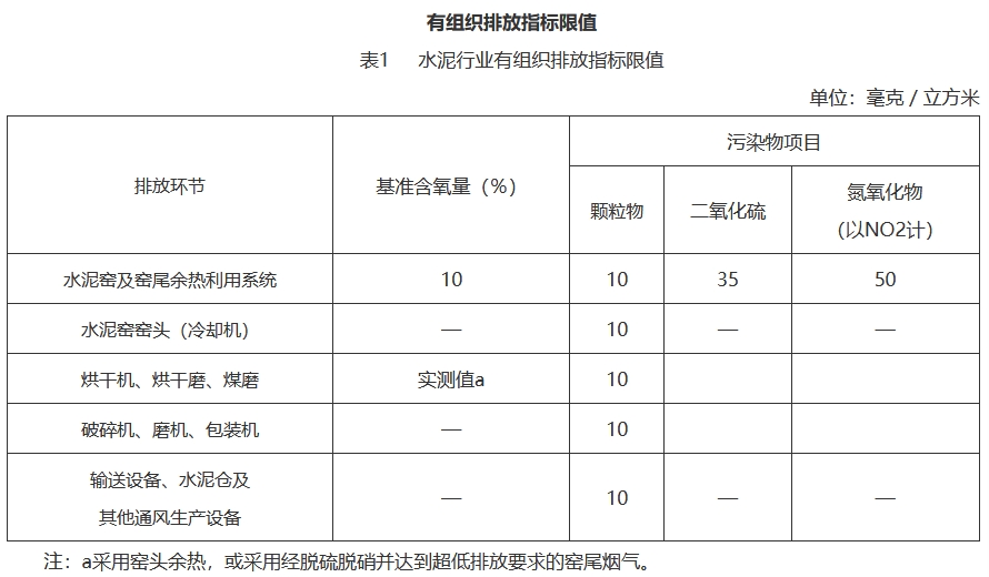 水泥企業(yè)在基準(zhǔn)含氧量10%的條件下,水泥窯及窯尾余熱利用系統(tǒng)廢氣顆粒物、二氧化硫、氮氧化物排放濃度小時(shí)均值分別不高于10mg/m3、35mg/m3、50mg/m3。