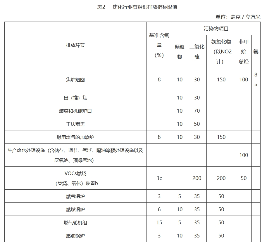 焦化企業(yè)在基準(zhǔn)含氧量8%的條件下,焦?fàn)t煙囪廢氣顆粒物、二氧化硫、氮氧化物、非甲烷總烴、氨排放濃度小時(shí)均值分別不高于10mg/m3、30mg/m3、150mg/m3、100mg/m3、8mg/m3;生產(chǎn)廢水處理設(shè)施非甲烷總烴濃度小時(shí)均值不高于100mg/m3。其他污染源顆粒物排放濃度小時(shí)均值不高于10mg/m3。