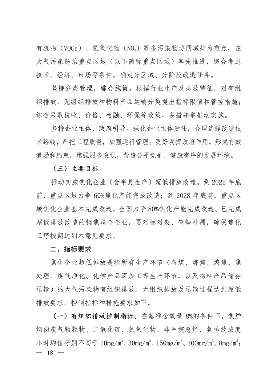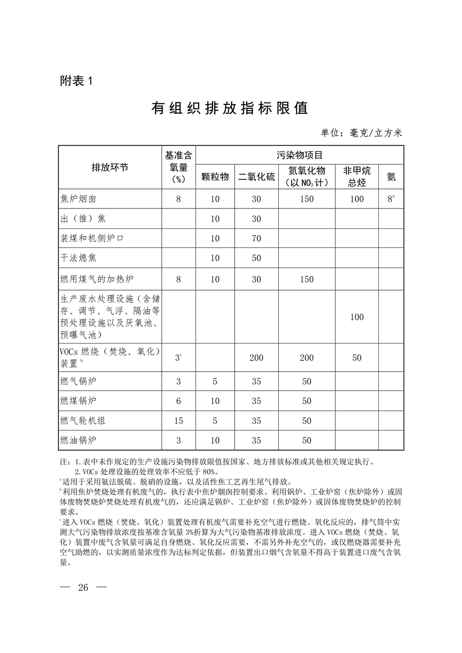要求在基準含氧量8%的條件下,焦爐煙囪廢氣顆粒物、二氧化硫、氮氧化物、非甲烷總烴、氨排放濃度小時均值分別不高于10mg/m3、30mg/m3、150mg/m3、100mg/m3、8mg/m3;生產(chǎn)廢水處理設(shè)施非甲烷總烴濃度小時均值不高于100mg/m3。其他污染源顆粒物排放濃度小時均值不高于10mg/m3。
